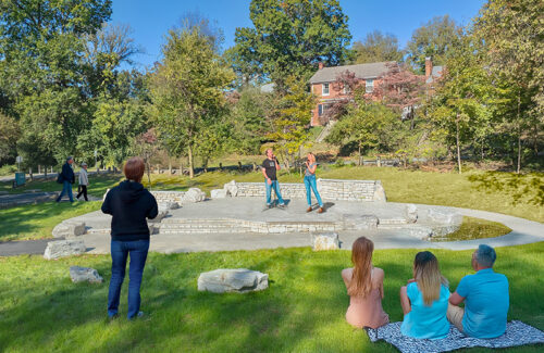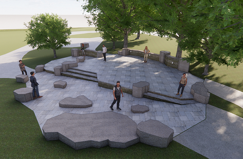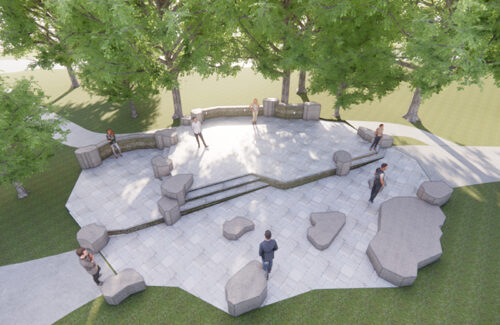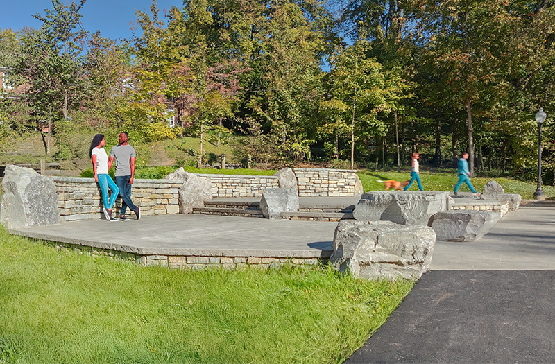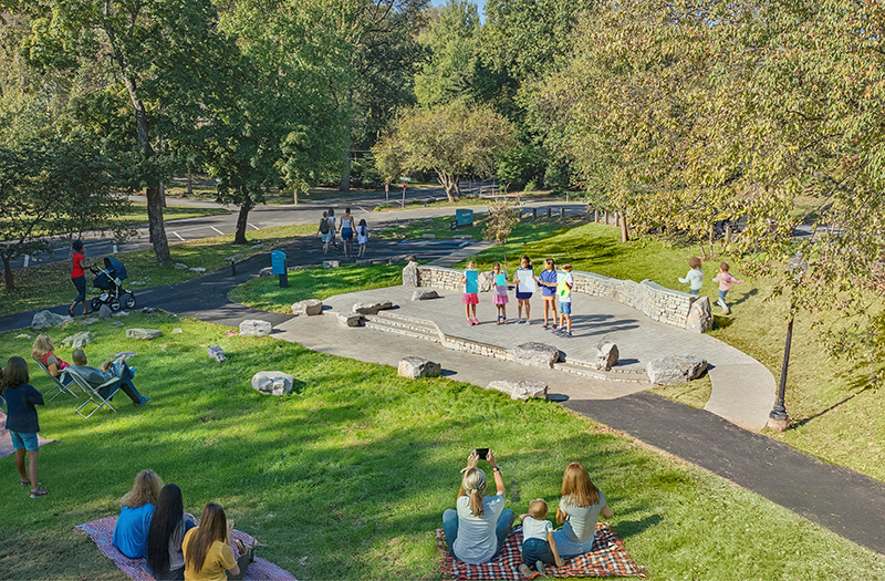 Designed for flexibility, the three-tiered stone stage accommodates small to medium size musical and theatrical performances. Natural stone retaining walls provide a sense of enclosure and house the essential electrical infrastructure to support lighting and sound requirements. Boulder outcroppings add playful elements and offer informal seating options for visitors. Enhanced parking area and ADA access improvements at the park’s we entrance were designed to accommodate increased traffic while maintaining the park’s charm. The result is a thoughtful, permanent performance venue that respects the park’s legacy, enhances its functionality, and demonstrates that nature and the performing arts are a perfect pairing.